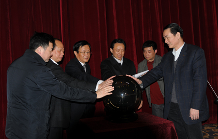 總經(jīng)理張春雷(左三)與荊州市領(lǐng)導(dǎo)共同啟動(dòng)水晶球 3月29日,枝江酒業(yè)與荊州新視界農(nóng)村電影院線公司聯(lián)手,正式啟動(dòng)“知心知己枝江酒,…