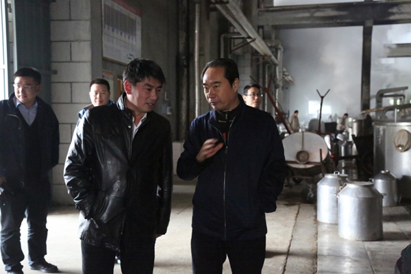 枝江酒業(yè)總裁曹榮開(kāi)陪同秦書(shū)堯、朱玉祥等一行在釀造三車(chē)間參觀